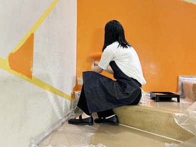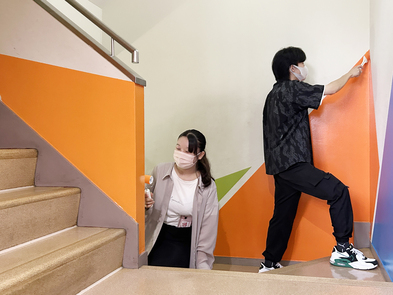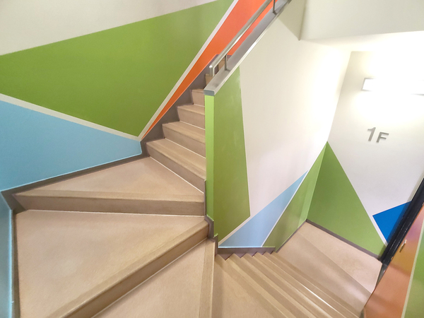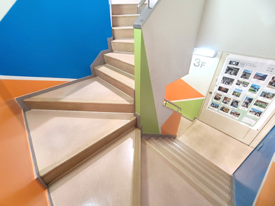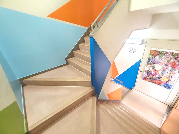 2024年08月21日(水) 階段の壁面塗装 学校内の階段がカラフルになりました! 暗い印象だった階段を明るい印象にするため、教員と学生が自分たちで塗装しました。 フロアによって配色を変え、楽しく明るい気持ちになれる階段が完成しました。