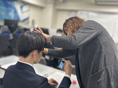 身だしなみ講座では、髪や眉の整え方、スーツの着こなしなど、社会人として大切なポイントを分かりやすく説明していただきました。