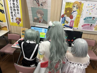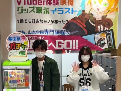 オリジナル缶バッジのガチャガチャや授業で使っている液晶タブレット、学生が作ったゲーム、Vtuber体験、絵本やグッズの展示などを楽しんでいただきました。