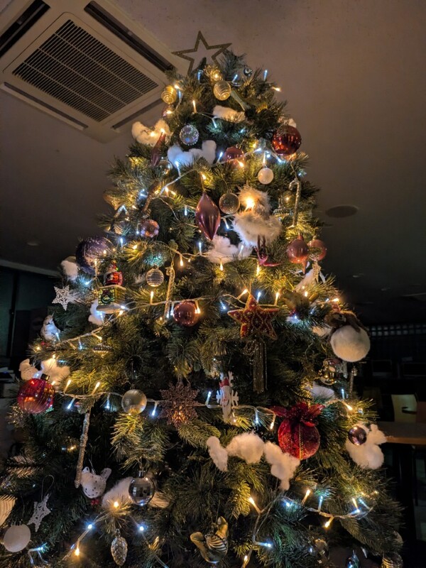 2025年12月01日(月) クリスマスツリーを飾りました クリスマスシーズンに合わせて、カフェテリアにクリスマスツリーを飾りました。 カフェテリアが普段より華やかな空間になり、夕方にはライトアップされるためクリスマス気分を味わうことができました。
