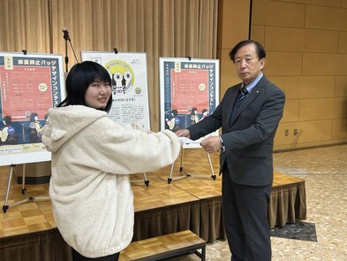 「第11回 痴漢防止バッジデザインコンテスト」では、同じくクリエイティブデザインコース1年生の作品が入賞し、天野副校長より表彰が行われました。