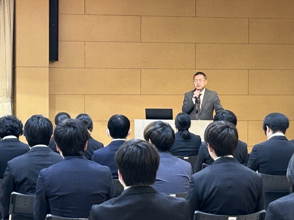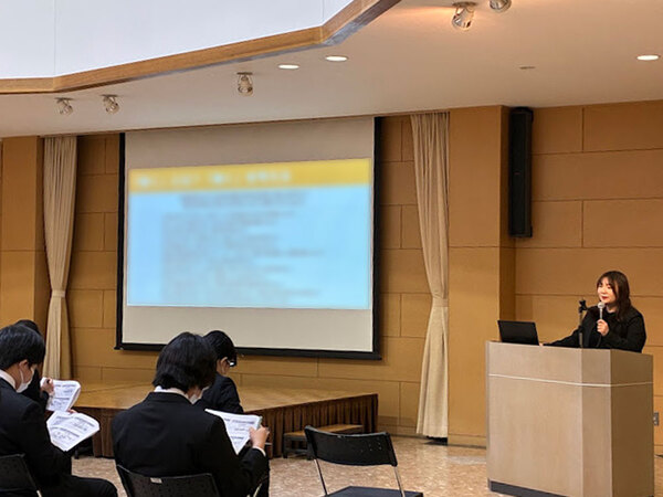 当日は名大社の宇佐見様にお越しいただき、山本学園ホールにて就職活動の全体の流れについてお話をしていただきました。