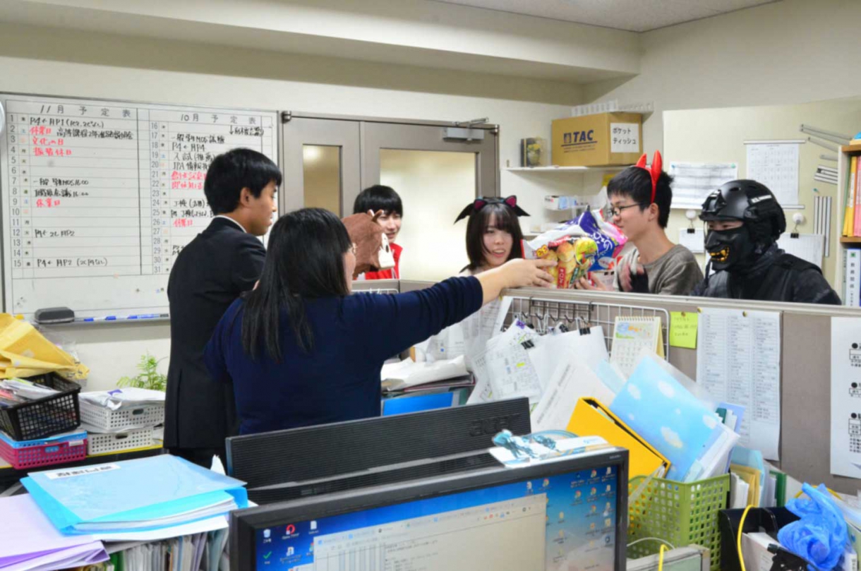 2019年10月31日(木) ハロウィンイベント お昼休みに学生自治会主催で仮装イベントを行いました。 皆さんそれぞれが好きな仮装をし、お菓子を配ったり貰ったり、写真を撮ったりして楽しみました。 職員室にも「トリック or トリート」と現れて、先生達ともお菓子の交換をしました。